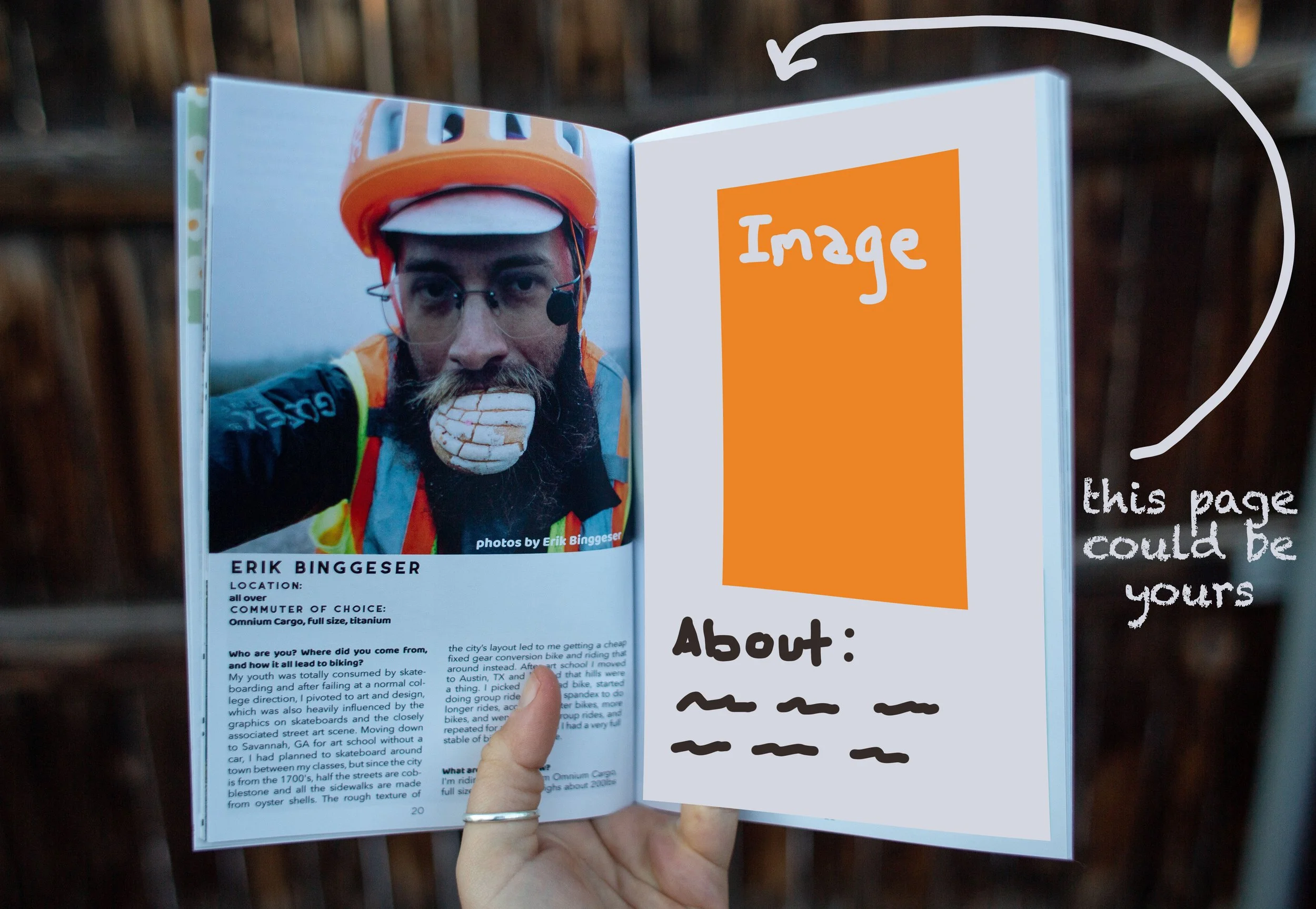 We’d love to hear a little bit about you to make sure you align with the zine. IE, we won’t allow any motor vehicle, pro highway building, etc. You get the point.